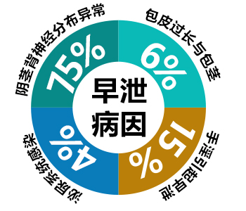 1、阴茎敏感神经分布异常:早泄病人由于先天的发育异常、或手淫过多等后天的不良习惯,导致阴茎敏感神经分布异常,对性刺激高度敏感,过快射精。